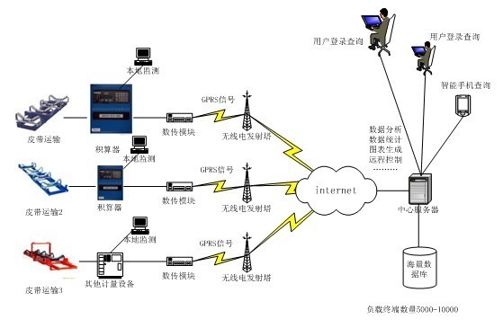 称重桥架安装于输送机架上,当物料经过时,计量托辊检测到皮带机上的物料重量通过杠杆作用于称重传感器,产生一个正比于皮带载荷的电压信号。速度传感器直接连在大直径测速滚筒上,提供一系列脉冲,每个脉冲表示一个皮带运动单元,脉冲的频率正比于皮带速度。称重仪表从称重传感器和速度传感器接收信号,通过积分运算得出一个瞬时流量值和累积重量值,并分别显示出来。